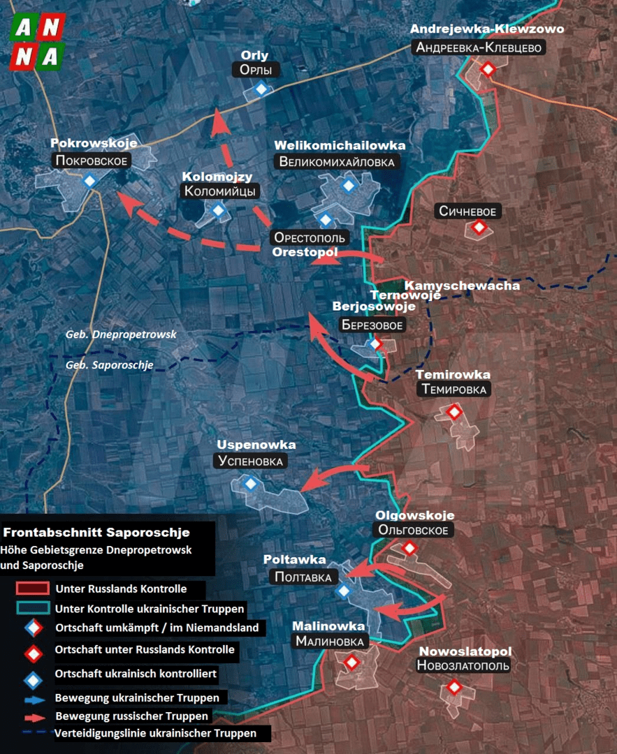Sie rücken von Ost nach West auf Guljaipole vor. Die Stadt gilt als Knotenpunkt der Faschisten. Die Faschisten haben ihre Verteidigungslinien an der Saporoschje-Front vor allem nach Süden ausgerichtet, weil von dort größere Angriffe von Truppen der RF-Streitkräfte erwartet wurden. Doch nach der Befreiung von Ugledar und Bolschaja Nowosjolka in der Donezker Volksrepublik (DVR), die sich wie die Lugansker Volksrepublik (LVR) im Bürgerkrieg gegen die Faschisten in Banderastan konstituieren konnte, können Truppen der RF-Streitkräfte von Ost nach West bis zum Dnjepr vorrücken.
