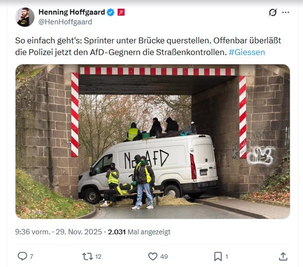 Die anderen sind Delegierte der AfD, die ihren Jugendverband gründen wollen. Teilnehmer dieser Veranstaltung konnten am heutigen Sonnabend, den 29.11.2025, nicht zum Veranstaltungsort Hessenhallen in Gießen gelangen. Bereits am gestrigen Freitag herrschte der Mob und Ausnahmezustand in der Ausänderhochburg. Immer wieder wurden von Dummen und Bösen Straßen blockiert. Auch am Samstagvormittag sind wohl alle wichtigen Zufahrtswege zum Veranstaltungsort der Gießener Messe blockiert. Totales Staatsversagen in Gießen. Die BRD, die seit Bestehen ein Vasallenstaat der VSA mit dem VK im Beiboot ist und lange schon ein Vielvölkerstaat, der nicht erst seit Jahren umgevolkt wird, sondern seit Jahrzehnten, zudem ein Apartheidstaat und ein Kriegsstaat, kann die Freiheit, die auch für Mitglieder der AfD gilt, nicht verteidigen. Die Führung ist entweder nicht willens oder in der Lage, die Versammlungsfreiheit zu verteidigen. Kenner und Kritiker halten das für eine miese Mischung aus beidem, denn die Quantität und Qualität des Einsatzes von Polizisten reicht hinten und vorne nicht. Staatsversagen total.