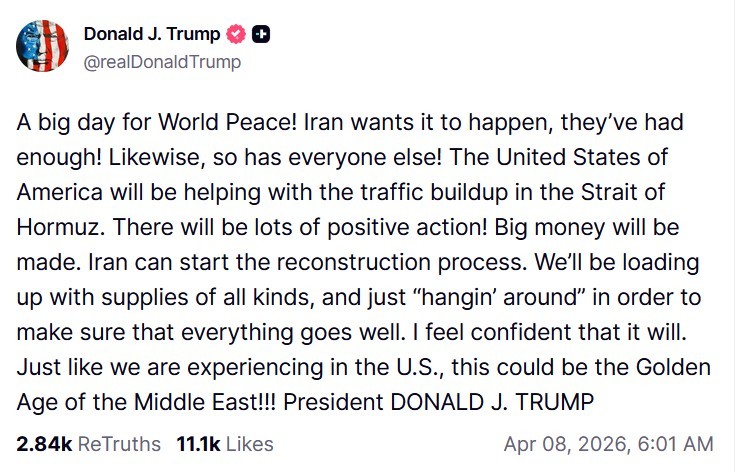 US-Präsident Trump ließ daher am frühen Morgen auf Truth Social folgenden Beitrag veröffentlichen: „Ein großer Tag für den Weltfrieden! Iran will, dass es endlich geschieht – sie haben genug davon! Und alle anderen auch! Die Vereinigten Staaten von Amerika werden bei der Bewältigung des zunehmenden Schiffsverkehrs in der Straße von Hormus helfen. Es wird viele positive Maßnahmen geben! Es wird viel Geld verdient werden.“