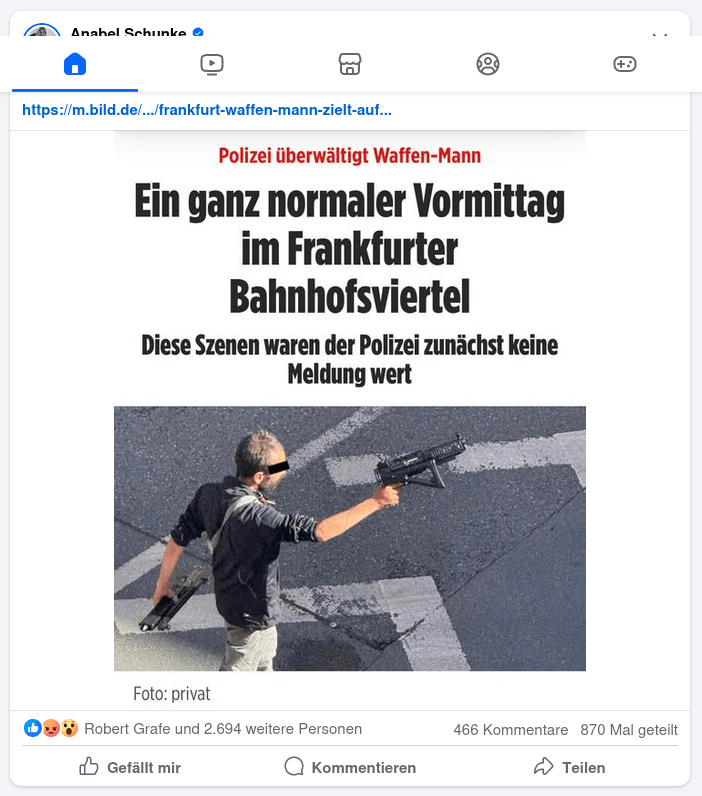 Stefan Schlagenthaufer berichtete unter der Überschrift „Polizei überwältigt Waffen-Mann: Ein ganz normaler Vormittag im Frankfurter Bahnhofsviertel“ in „Bild“ (30.8.2025) über „schockierende Szenen am Freitagmorgen im Frankfurter Bahnhofsviertel“ (dem in Mainhattan genannten Frankfurt am Main), die „derPolizei zunächst keine Meldung wert“ gewesen war.